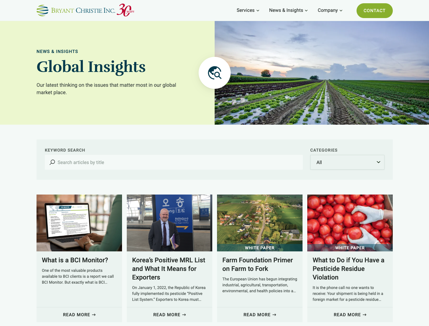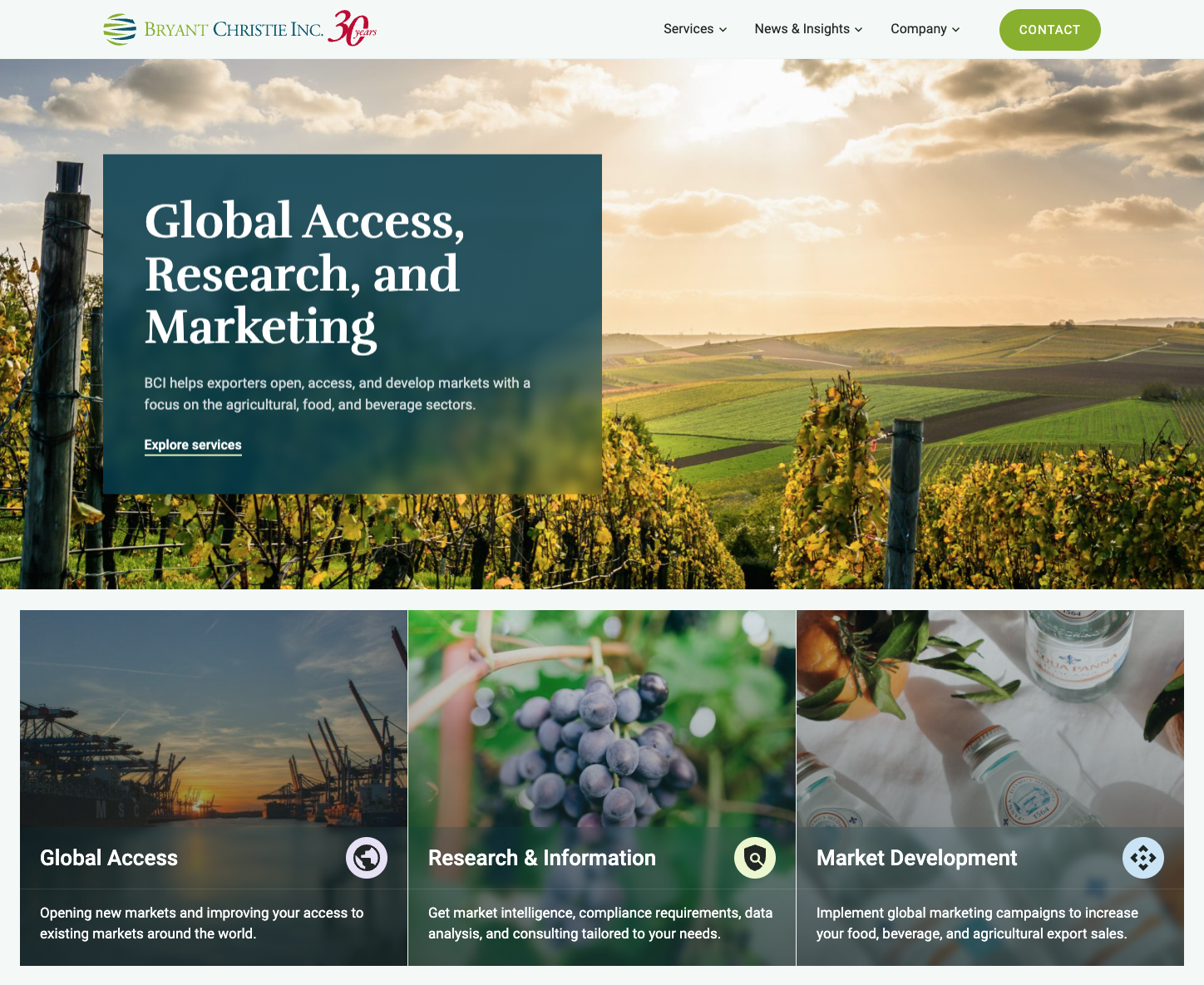 I've been working together with Bryant Christie Inc. (BCI) for over ten years. Based out of Seattle, BCI leverages modern technology to gather critical import/export regulatory data. With this information, they are able to deliver real-time product applications to their clients. To help compliment their cutting-edge products, BCI needed to redesign their brand identity and overhaul their website. In doing so, we created a visual interface to showcase their one-of-a-kind service offerings and made it easy for BCI's users to engage and explore.
